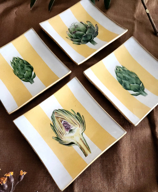 Conjunto 4 mini platos de pan diseño rayas y alcachofas 10cm