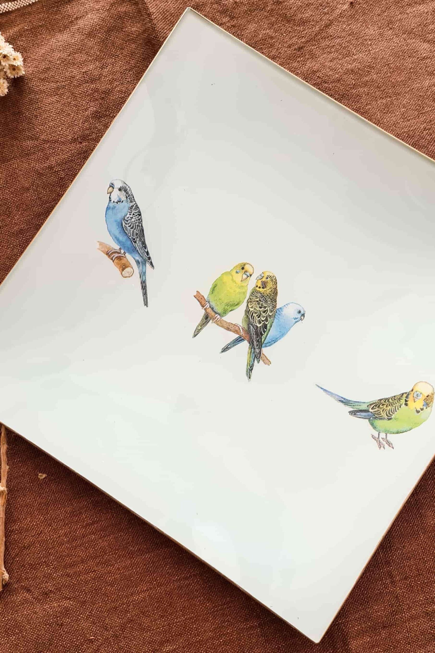 Elegante bandeja cuadrada con sofisticado diseño de pájaros. Ideal para servir aperitivos o como elemento decorativo en cualquier espacio.