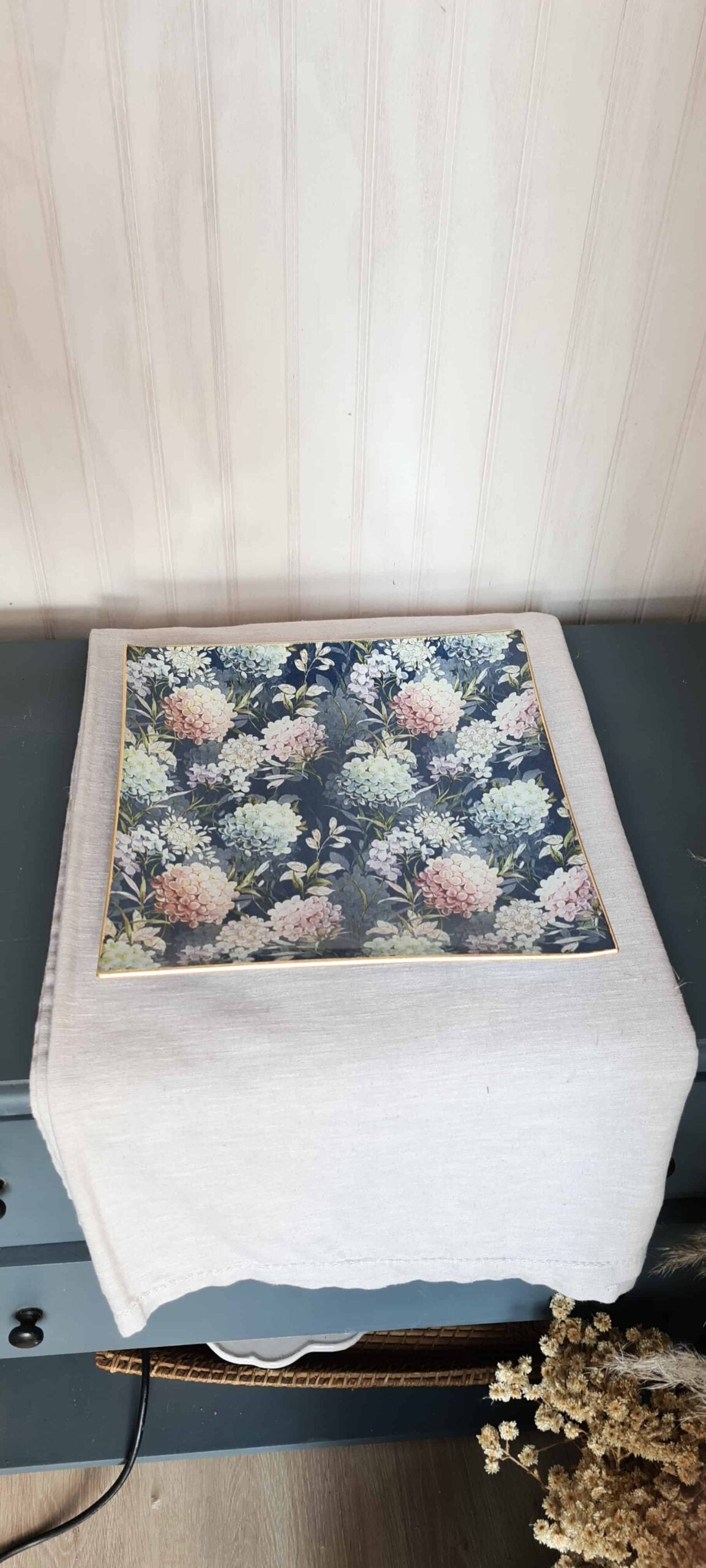 Elegante bandeja con sofisticado diseño de hortensias. Ideal para servir aperitivos o como elemento decorativo en cualquier espacio. Requiere lavado a mano para preservar su belleza y acabado artístico. Una pieza funcional que aporta distinción a su mesa.