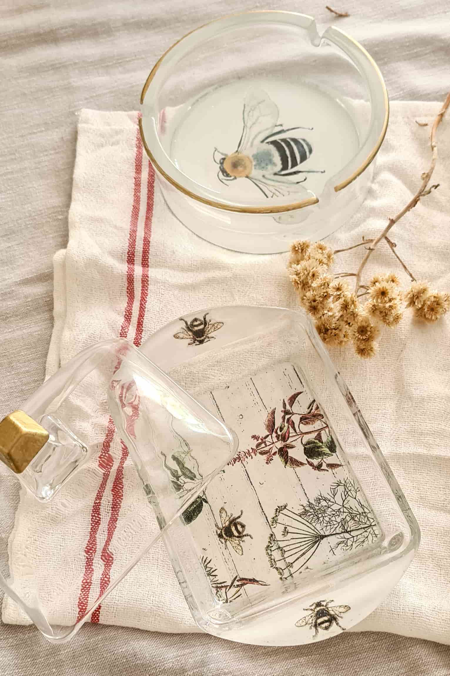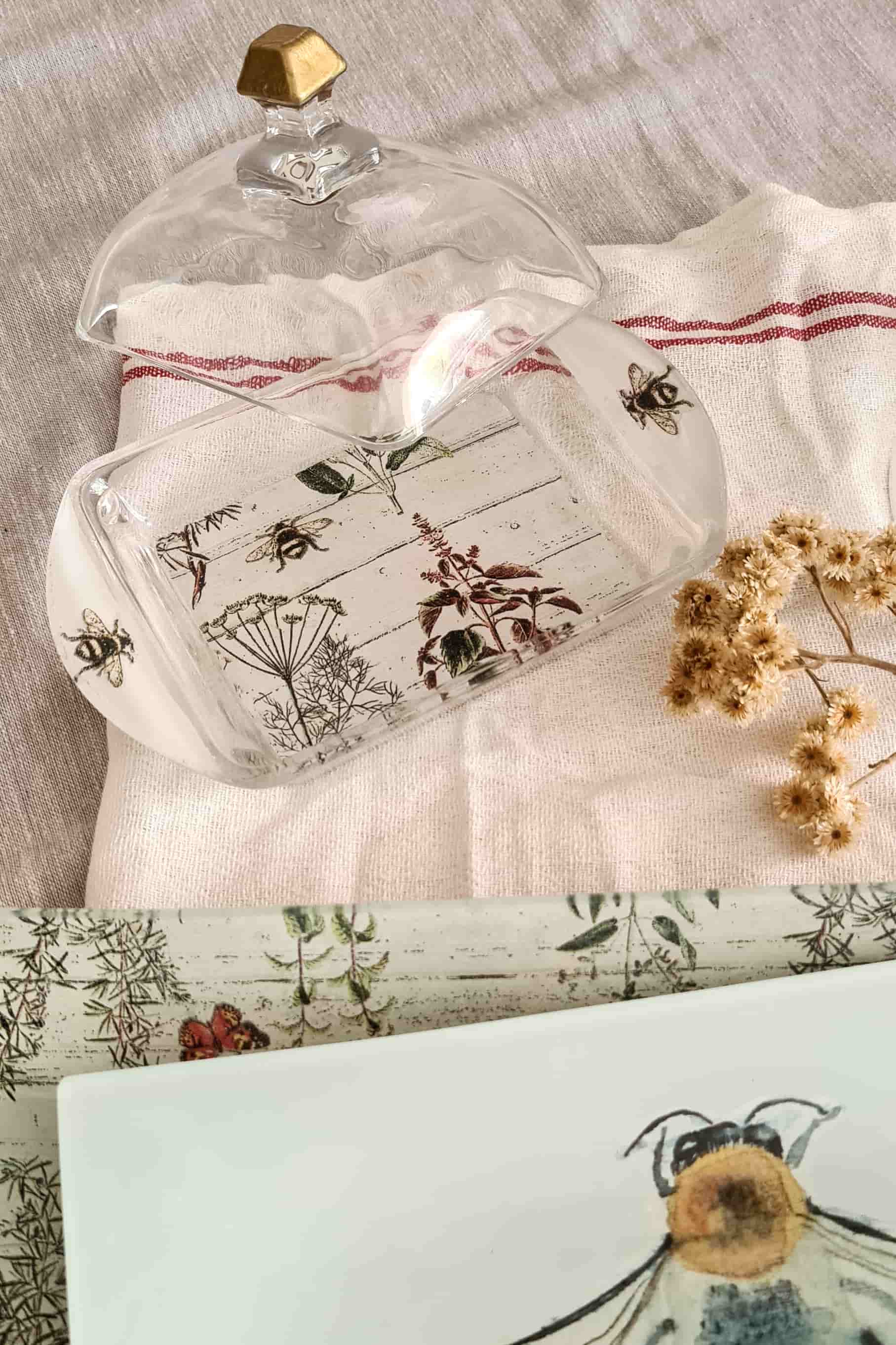 Mantequillera de vidrio con diseño de abejas, ofrece una combinación perfecta de funcionalidad y estética. Su acabado artesanal garantiza un producto único, ideal para conservar y presentar la mantequilla con elegancia.