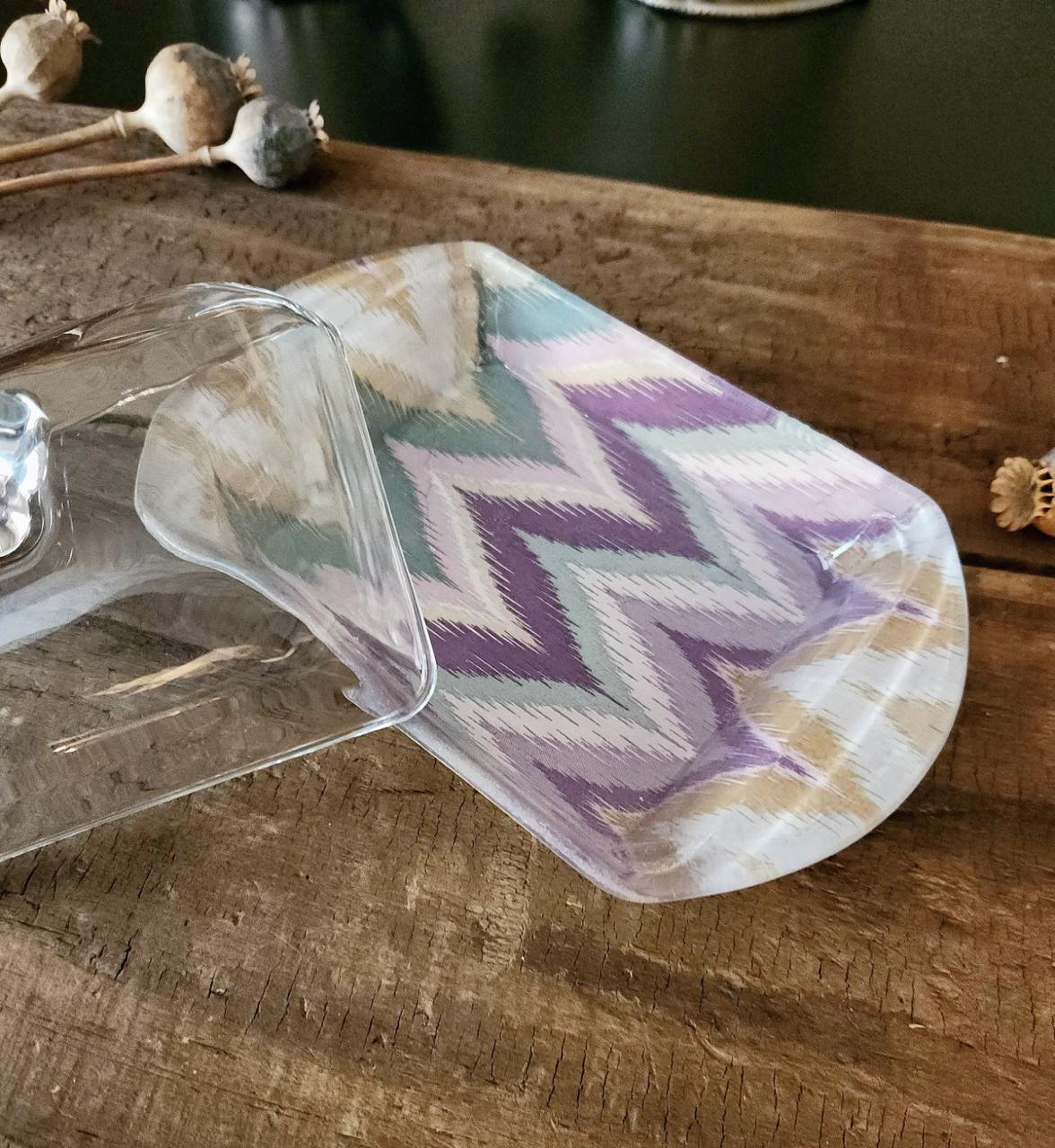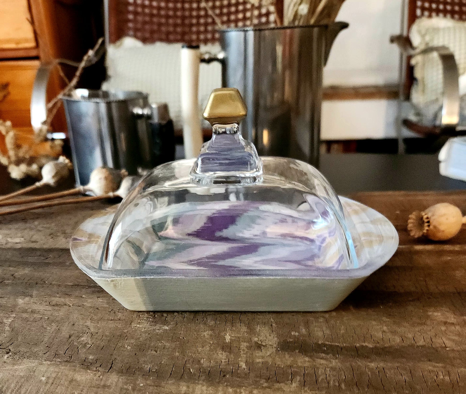 Esta mantequillera de vidrio, elaborada a mano con un exclusivo diseño de colores, ofrece una combinación perfecta de funcionalidad y estética. Su acabado artesanal garantiza un producto único, ideal para conservar y presentar la mantequilla con elegancia.