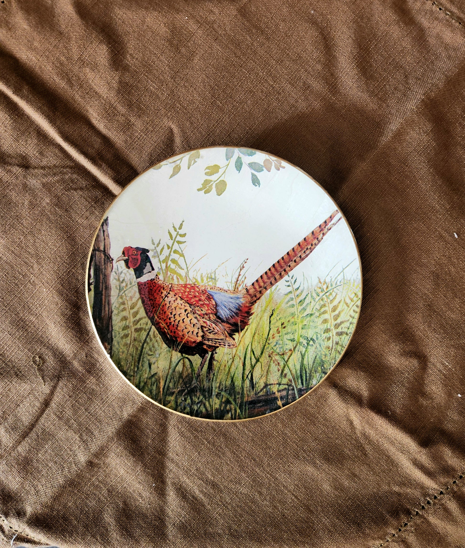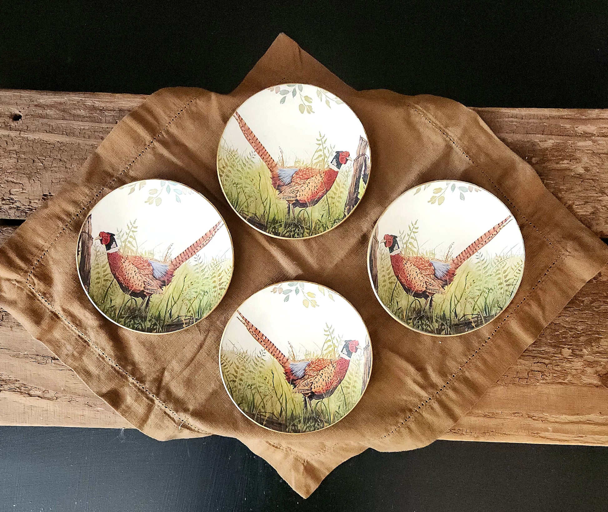 Conjunto de platos decorativos con elegante diseño de faisán, ideal para servir pan o pequeños aperitivos.
