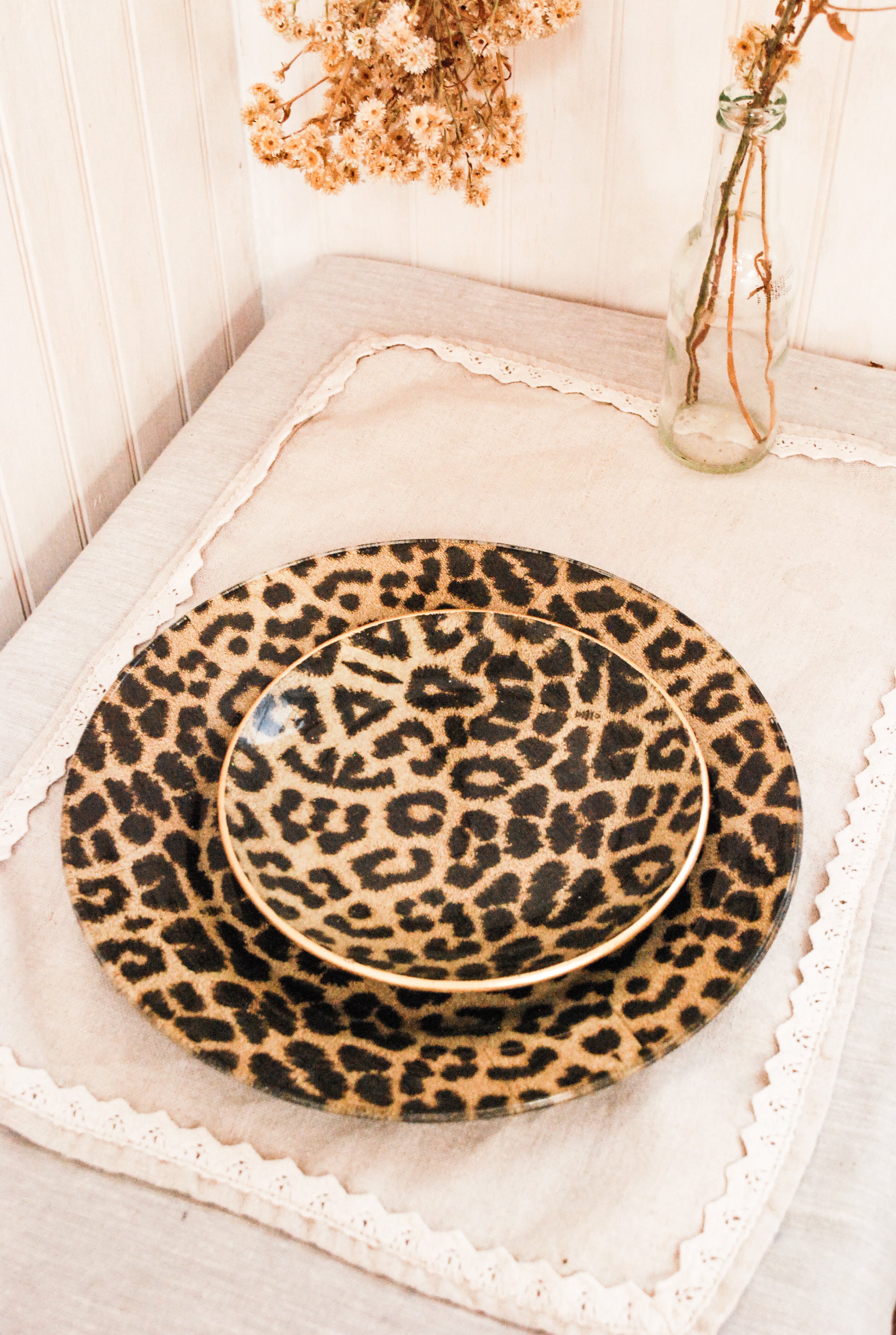Plato decorativo ideal para servir pan, con elegante diseño animal print que añade un toque sofisticado a cualquier mesa. Fabricado con materiales de calidad que requieren lavado a mano para preservar su acabado distintivo y prolongar su durabilidad.