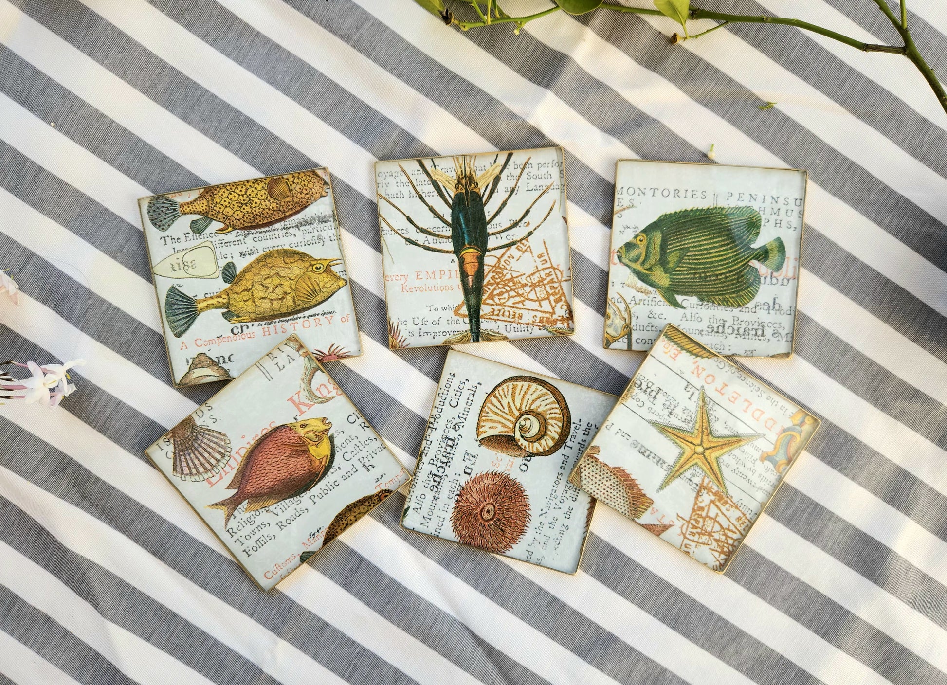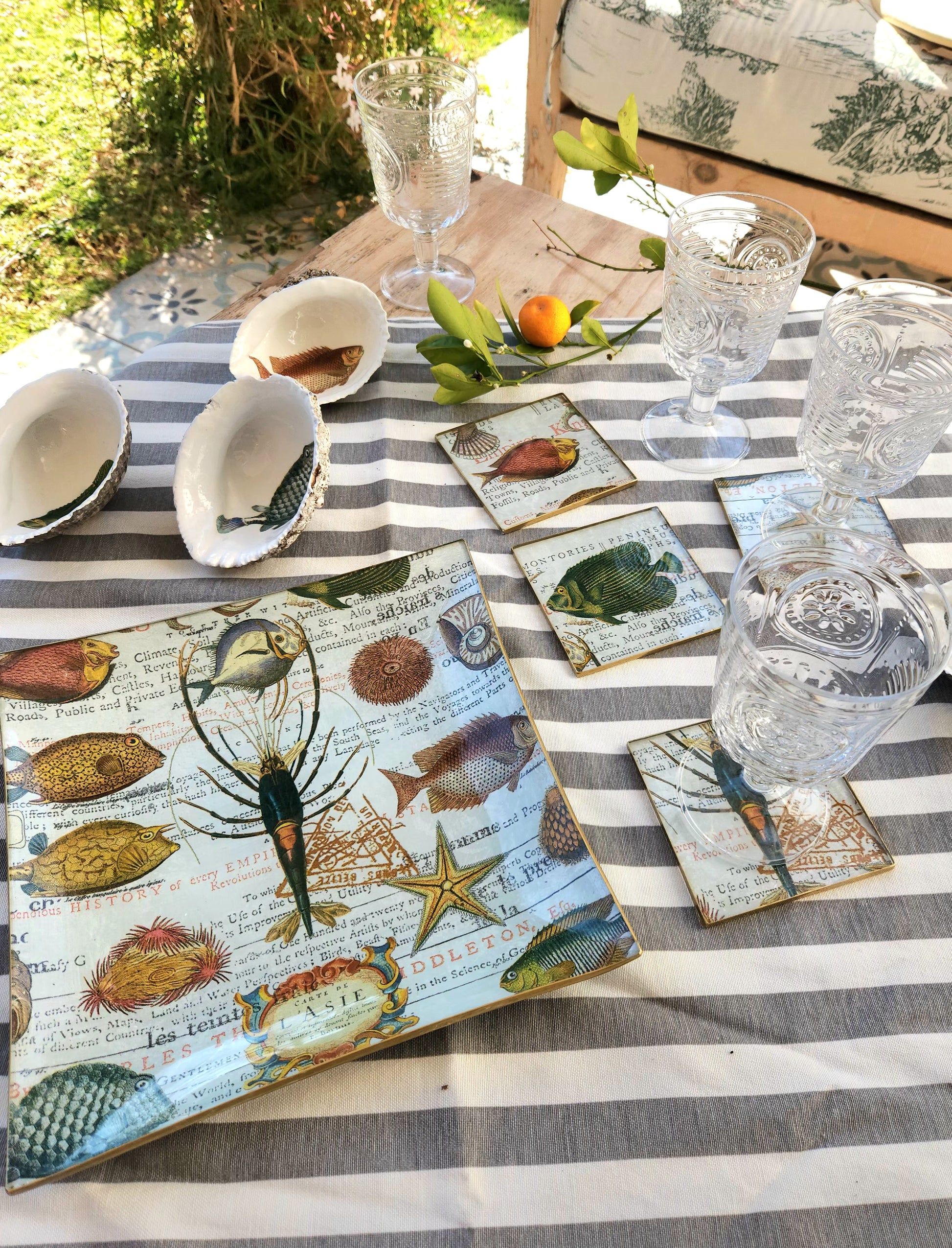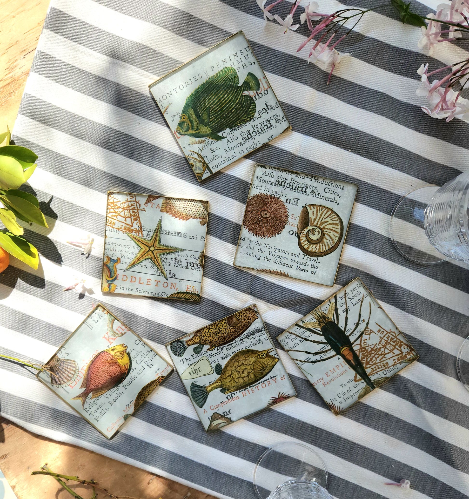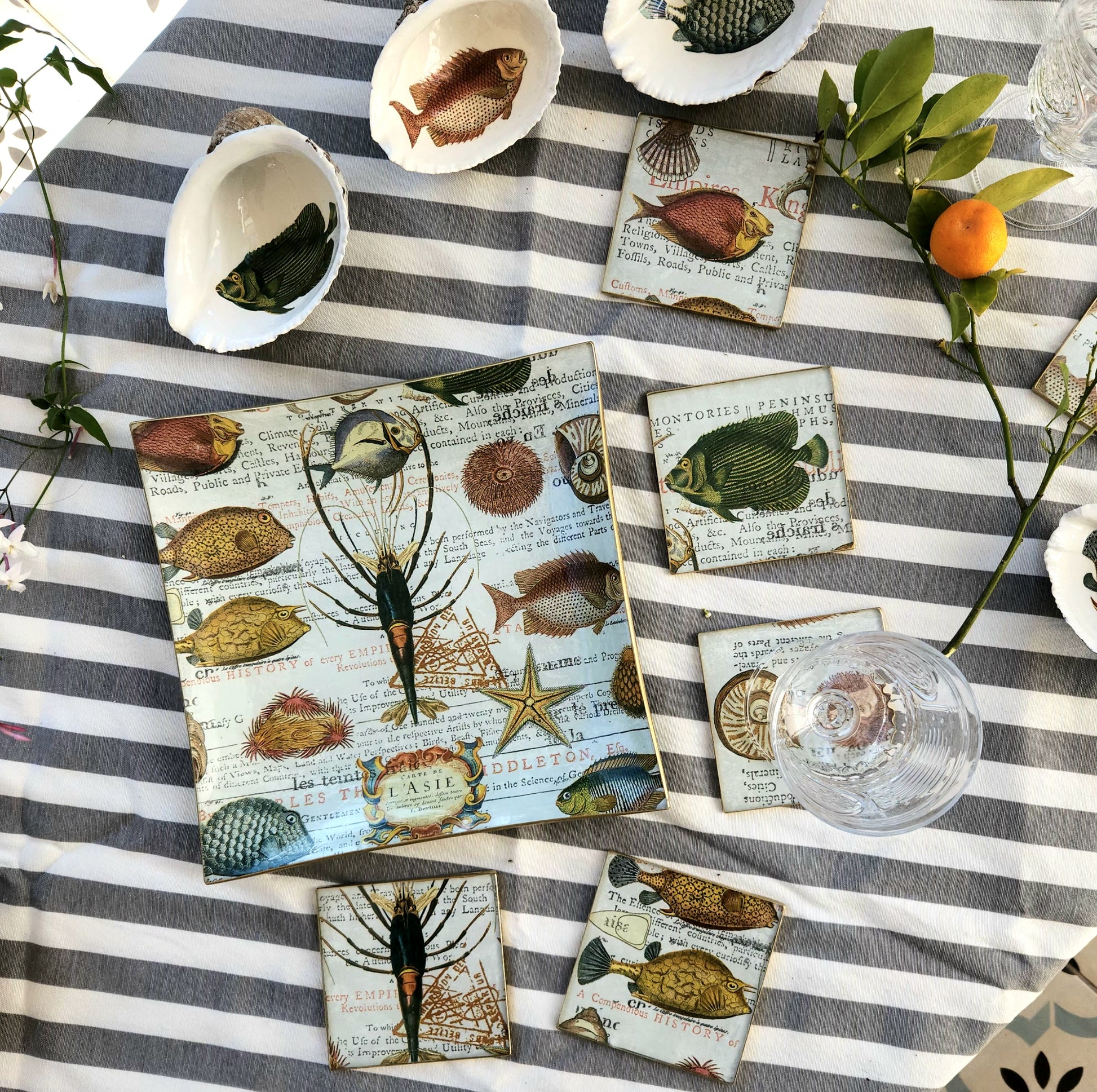 Este set de 6 posa vasos de vidrio, con un delicado diseño de peces inspirado en el mar, es hecho a mano con atención al detalle. Perfectos para proteger tus superficies con estilo, su fabricación artesanal garantiza piezas únicas.