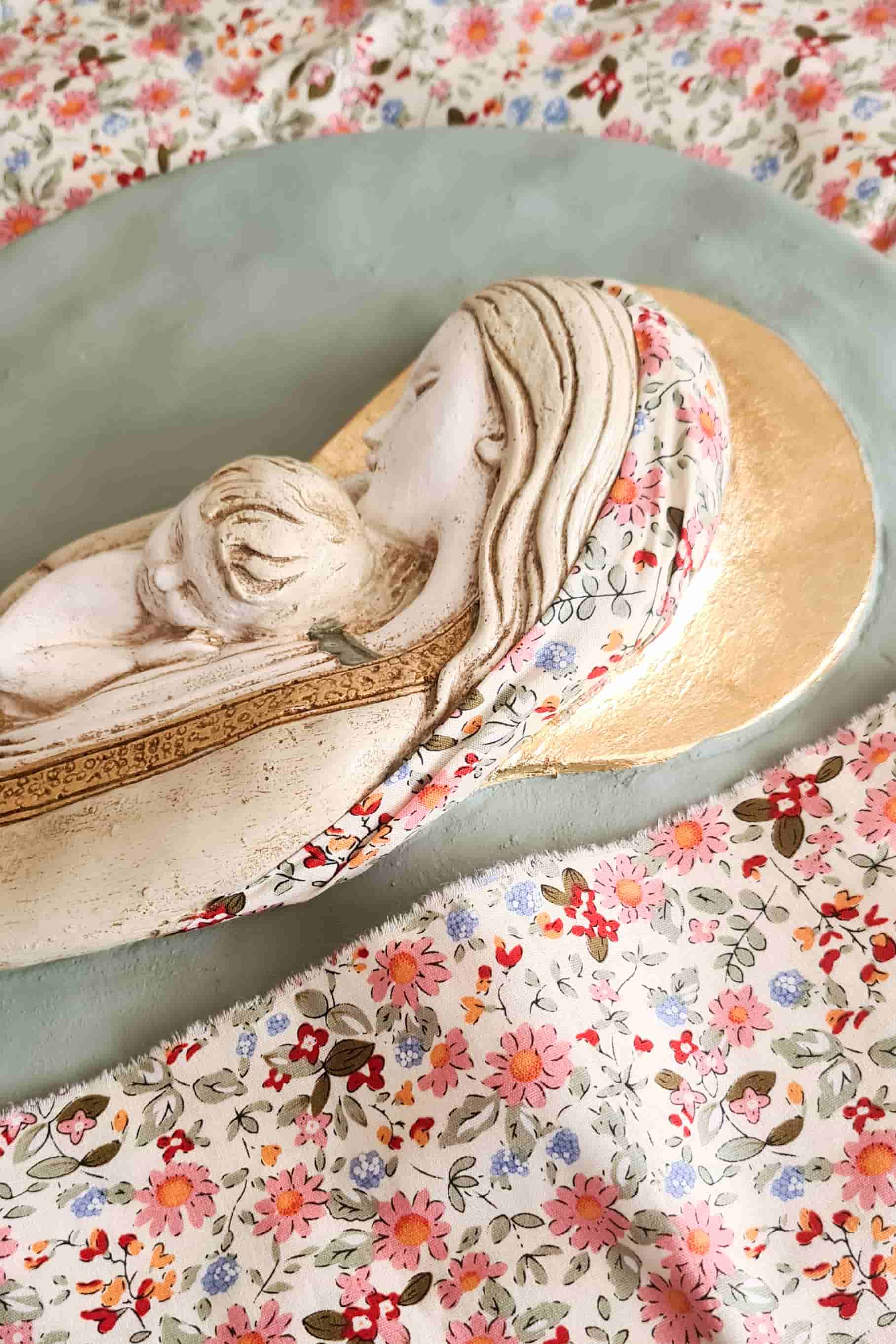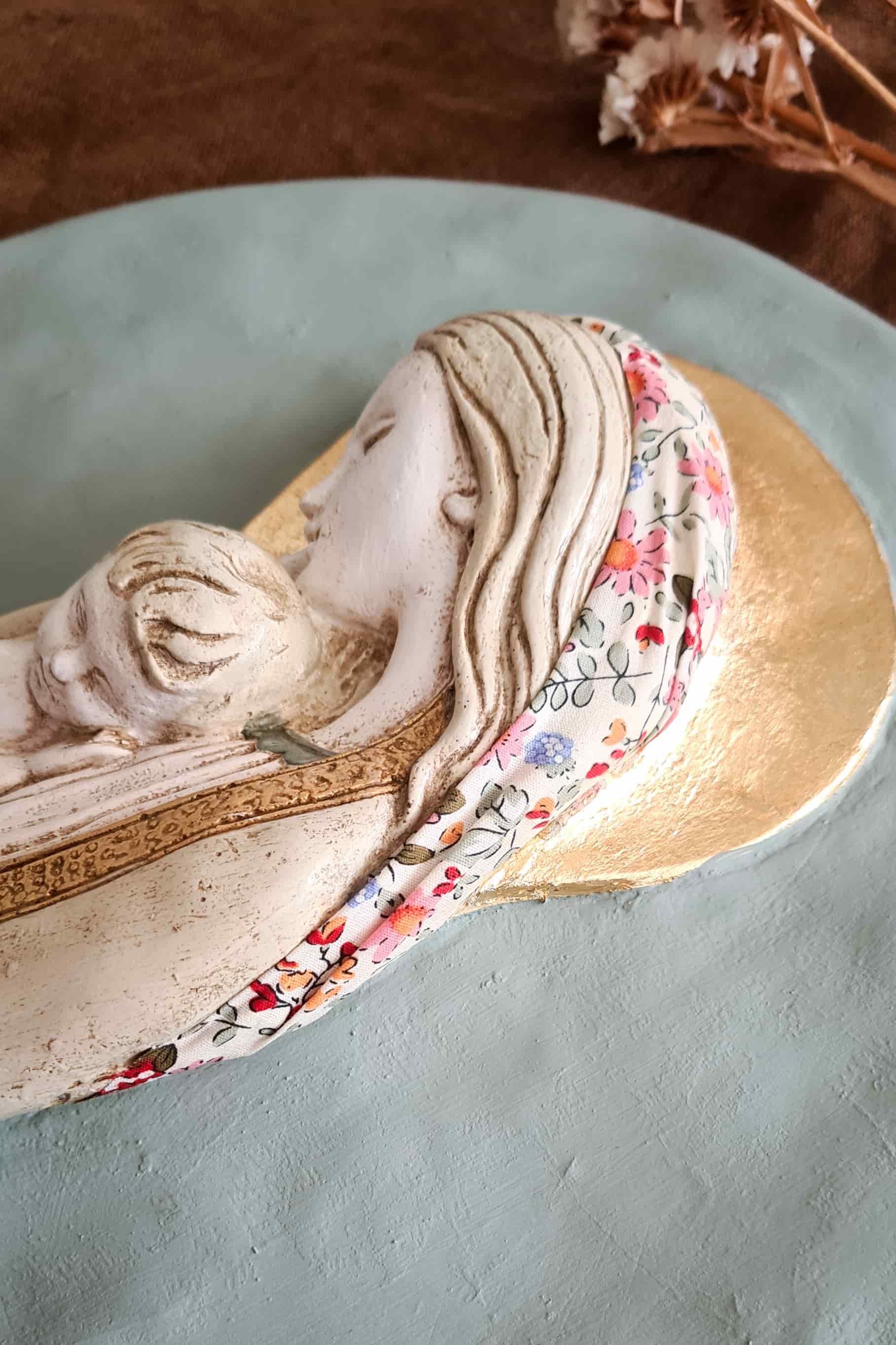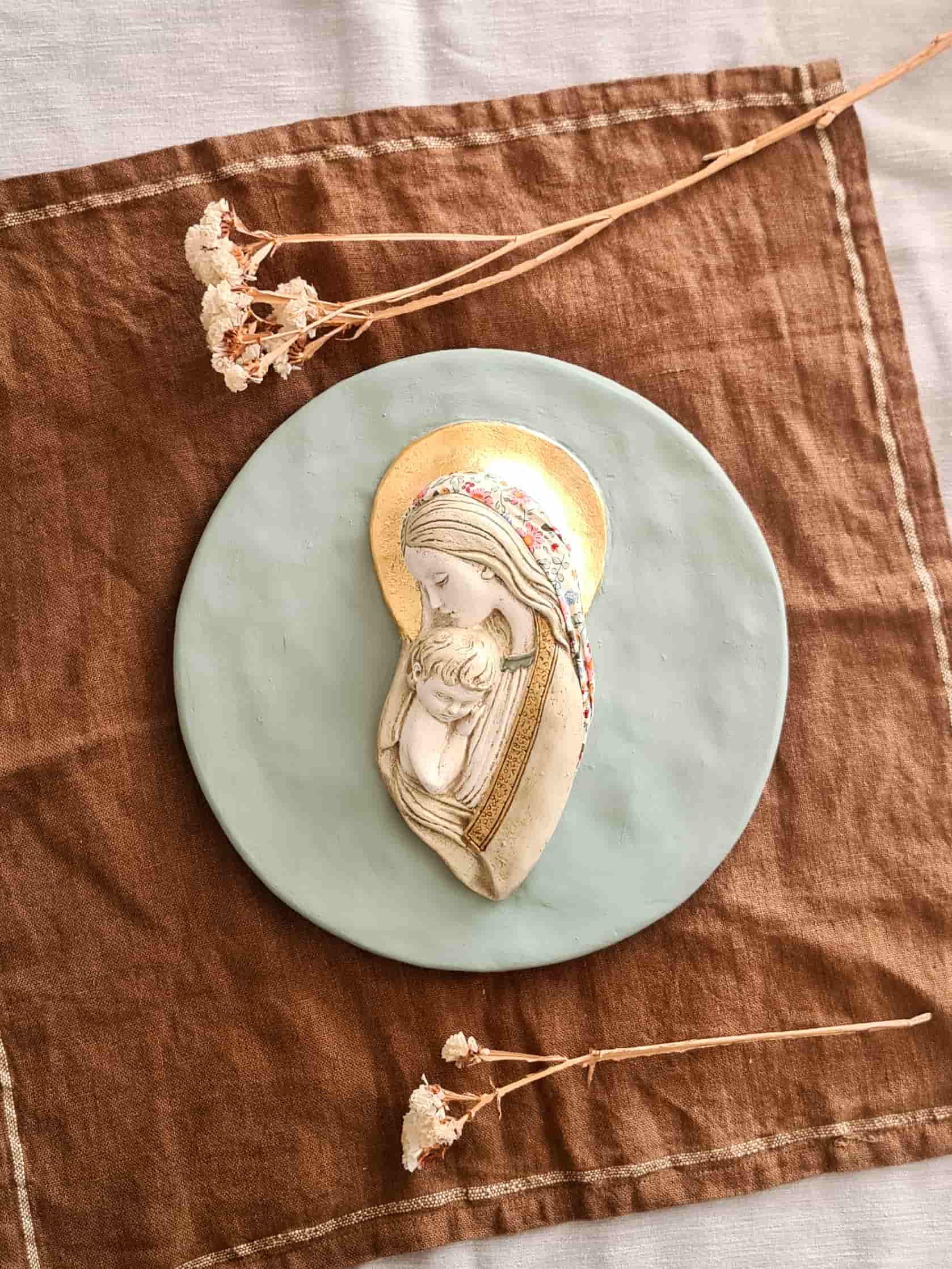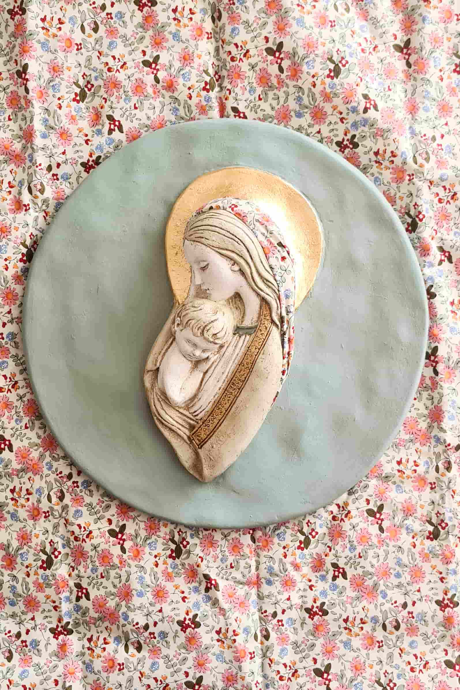 Virgen Liberty Beatriz meticulosamente pintada a mano con técnicas artesanales tradicionales. Presenta una base redonda de 28cm de diámetro y 5cm de altura, proporcionando estabilidad y elegancia. Cada pieza conserva características únicas del trabajo manual, convirtiéndola en un elemento devocional distinguido para espacios sagrados o personales.